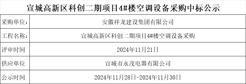 宣城高新區(qū)科創(chuàng)二期項(xiàng)目4#樓空調(diào)設(shè)備采購中標(biāo)公示