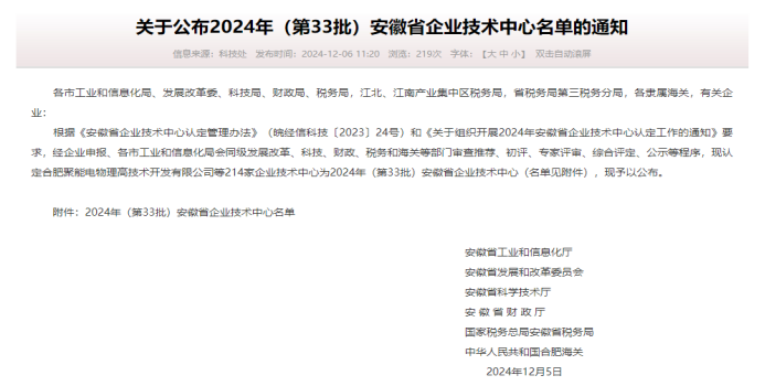 2024年12月5日,由安徽祥龍建設集團有限公司申報、經市初審推薦、初評、專家評審和綜合評定等多輪審查環節,現已公示結束,認定安徽祥龍建設集團有限公司技術中心為2024年(第33批)安徽省企業技術中心。